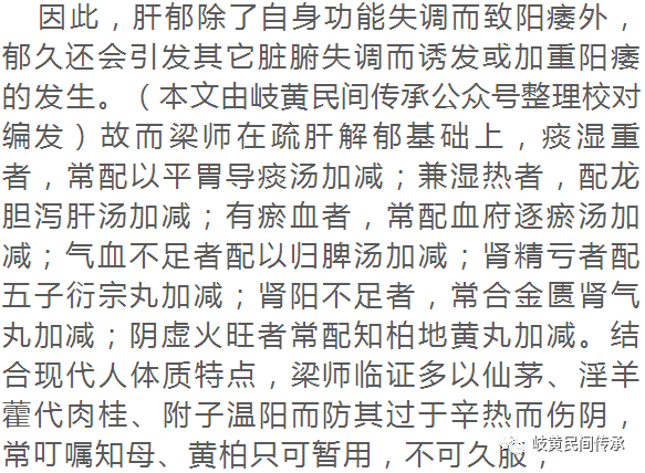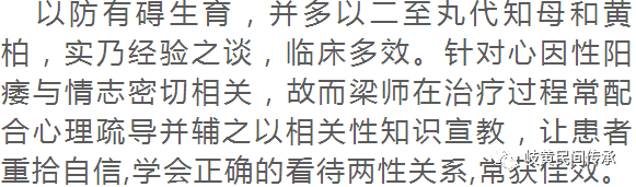 阳痿,指男子青壮年时期,由于虚损、湿热或惊恐等使宗筋弛纵,引起阴茎萎软不举,或临房举而不坚的病证。西医据病因将其分为心理性、器质性和混合性三种类型。临床以心理性阳痿多见,并且多发生在新婚、性知识缺乏的男性中,且多发病突然,独处时勃起正常,而临房时却出现难举、易痿等。梁师认为此多属功能障碍范畴,与情志最为密切,病位主要在肝,(本文由岐黄民间传承公众号整理校对编发)正如《杂病源流犀烛》曰:“……又有失志之人,抑郁伤肝,肝木不能疏达,亦致阴痿不起。”梁师认为足厥阴肝经、宗筋、阴器三者一脉相承。如《灵枢.脉经》曰:“肝者,筋之合也,筋者,聚于阴器。”男子宗筋包括阴茎、睾丸在内的外生殖器,实为肝所主,正如《增补病机沙篆》所言:“阴器者,宗筋之所系也……然厥阴主筋,故诸筋统属于肝也。”《灵枢.经脉》亦载:“肝足厥阴之脉……循股阴入毛中,过阴器”。